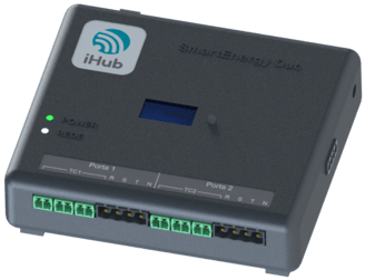 Medidor de energia IoT inteligente da iHUB. Com ele é possível medir até 35 parâmetros de energia AC (potência, consumo, corrente, etc) de até duas redes de energia de forma simultânea.