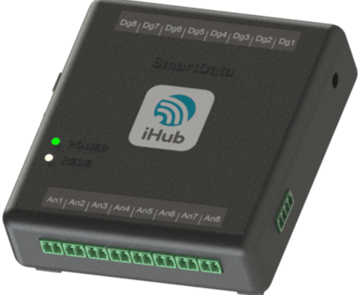 Medidor Datalogger IoT da iHUB. Com ele voce consegue medir grandezas de até 8 sensores analógicos e 8 sensores digitais ao mesmo tempo, permitindo monitorar parâmetros importantes para a sua operação, como porta aberta, temperatura, luminosidade, umidade, chuva, inundação, presença, vibração e vários outros.